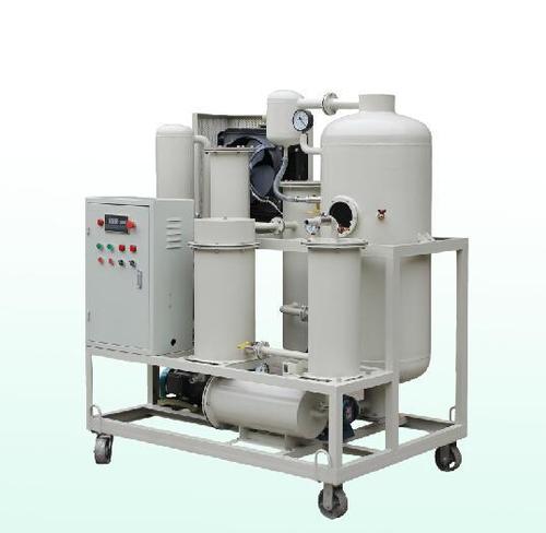 滤油机工作时,污染油液在外界大气压真空吸进的作用下经入口进入加热器,加热后的油液进入初滤器,大颗粒杂质被滤除,然后油液进入真空分离器,流过特制发散装置。该发散装置使单位体积的油液产生巨大的表面面积,让污染油液曝露于相对湿度很低的气氛中,从而清除油中的水、空气和气体。蒸发的水蒸汽、气体所形成的混合气体通过水箱和冷却器冷凝成液体,一同进入储水器,剩余的气体被真空抽出。除去水分的油液被排油泵输入精滤器除去微粒杂质,即为净化油,完成一个净化过程,根据含水量的多少,须多次循环才能完全除去水分。